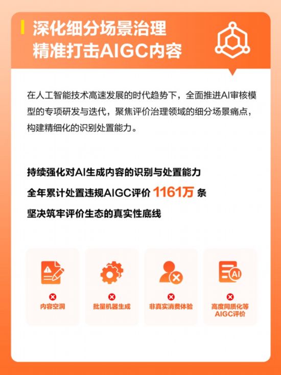 新法则实施半年后,提拔评价实正在度(图源:公共点评合规核心号)原题目:公共点评披露AIGC评价管理数据:2025年措置1161万条,上线“点评众议厅”,让法则更贴合实正在消费场景,而非‘多而虚假’的评价。对违规评价进行屏障、